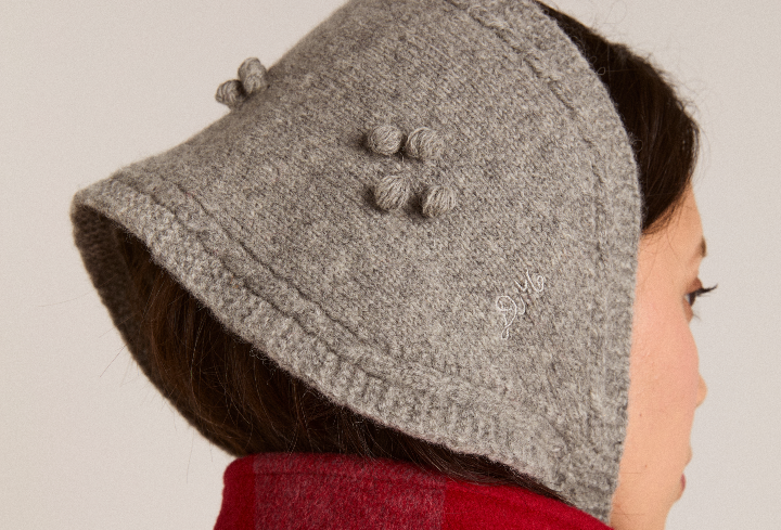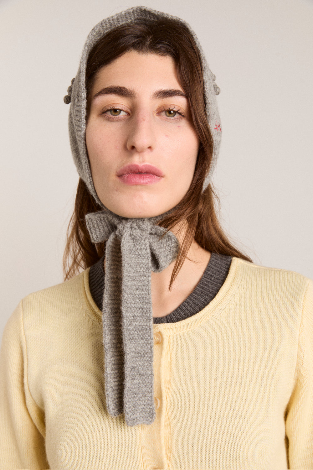 This sweet cable-knit style features bobble details, tonal grey DM embroidery and ties under the chin for a snug fit. Made from a soft, responsible blend of wool, mohair and recycled fibres. Designed in London.