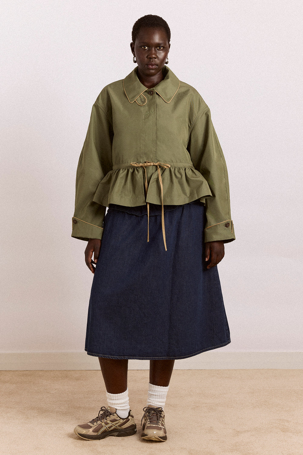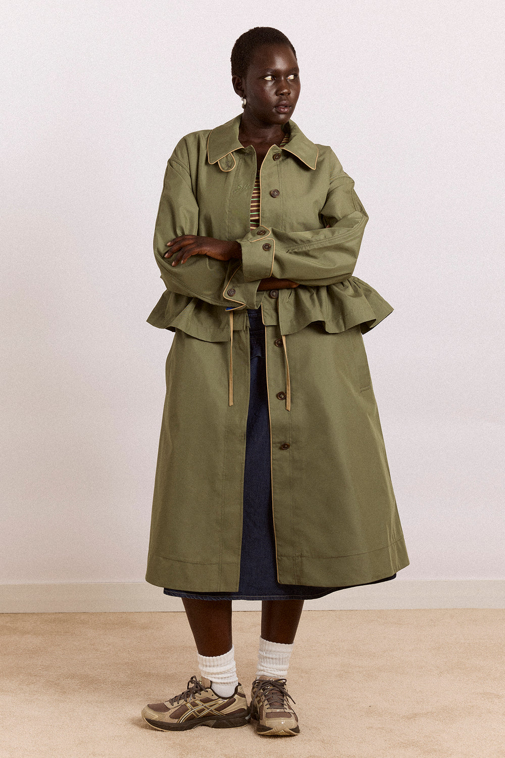 A versatile trench designed for everyday wear. The Myrtle features a multi-way silhouette that can be worn full length or with the skirt buttoned off to create a short jacket. Finished with a frill detail at the waist and an adjustable contrast tie for subtle shape. Cut with an intentionally oversized fit for easy layering. Made with a breathable fabric with a water- repellent finish, this garment is designed to keep light shower out, protecting you from the elements.