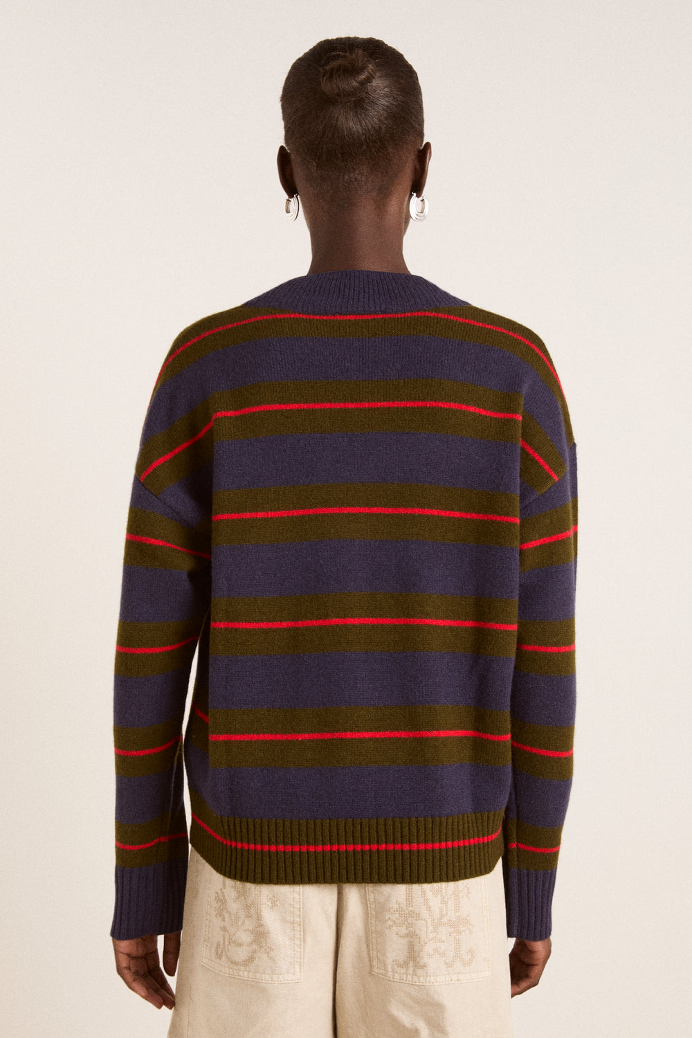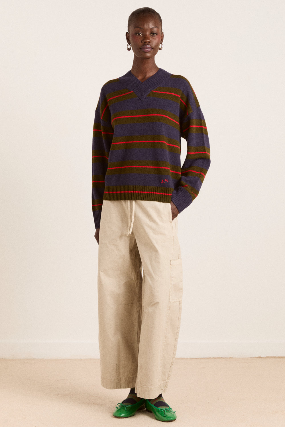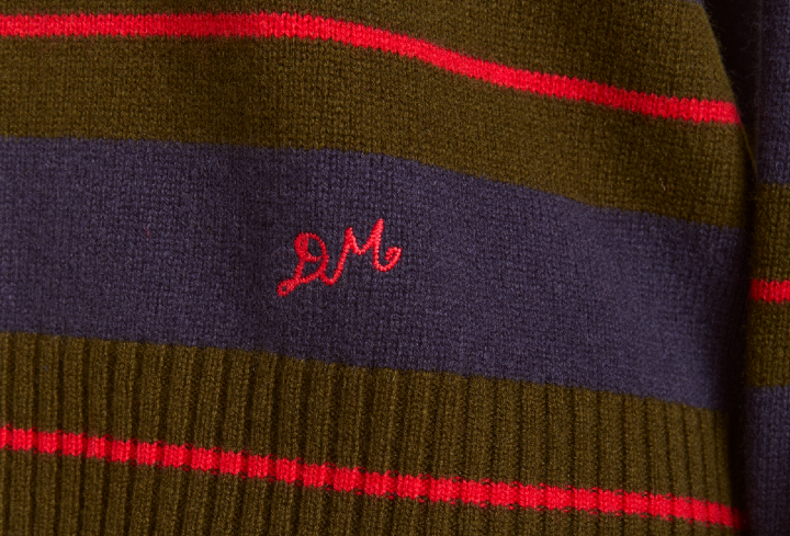 A relaxed essential with a graphic edge, the Odette v Neck is a boxy-fit knit in certified responsible wool standard merino wool, featuring an all-over stripe pattern and a flattering V neckline, striking a balance between bold and understated. Finished with subtle “DM” embroidery on the body for a signature touch.