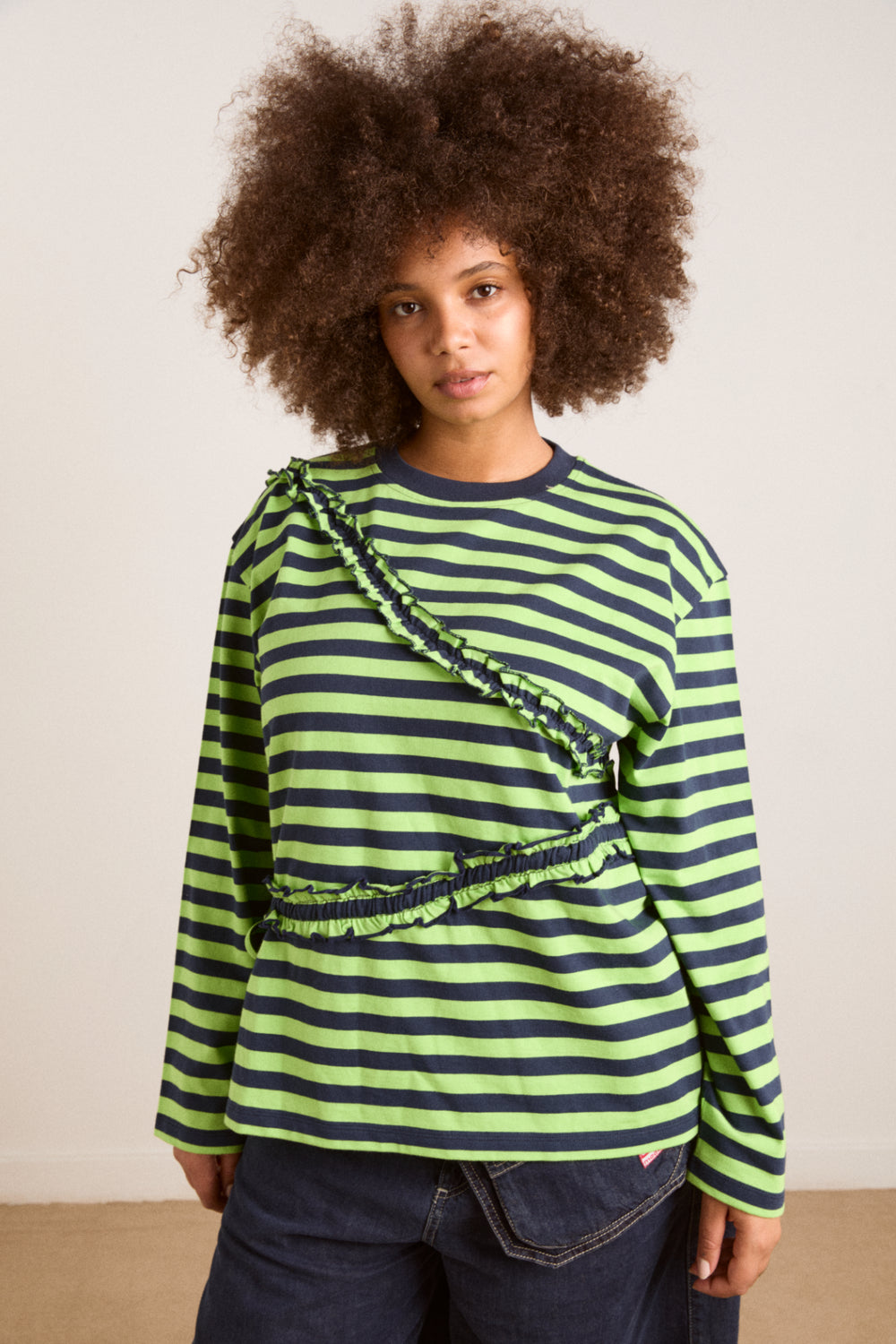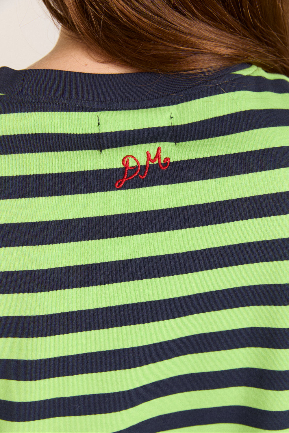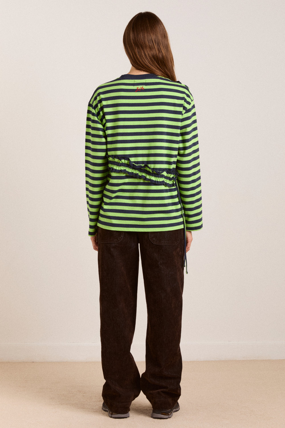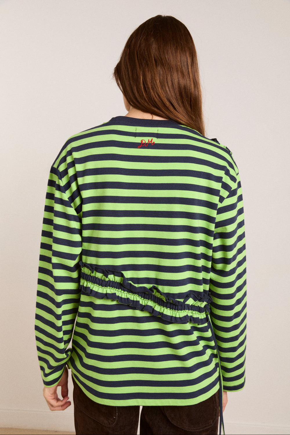 The Prudie Ruffle Long Sleeve Tee brings playful detailing to an easy, oversized silhouette. Designed in a yarn-dyed navy and lime stripe, it features soft self frill accents with adjustable ties to cinch and shape. Finished with a classic crew neck, navy rib trim and signature red DM embroidery at the back neck, it’s a statement tee made for everyday wear.