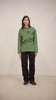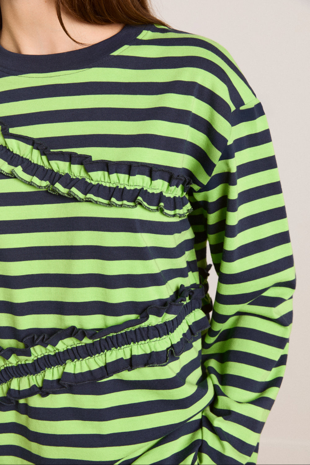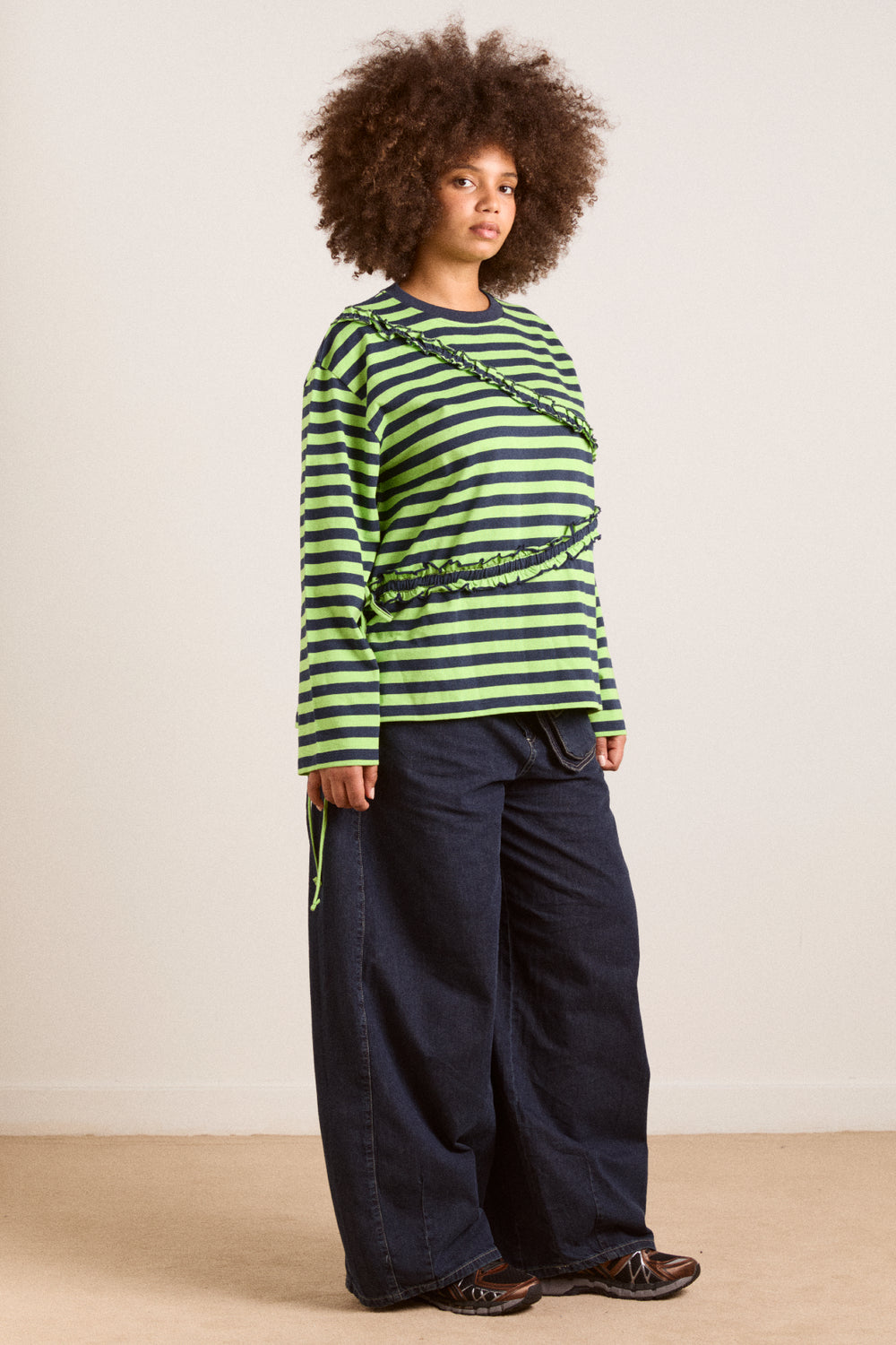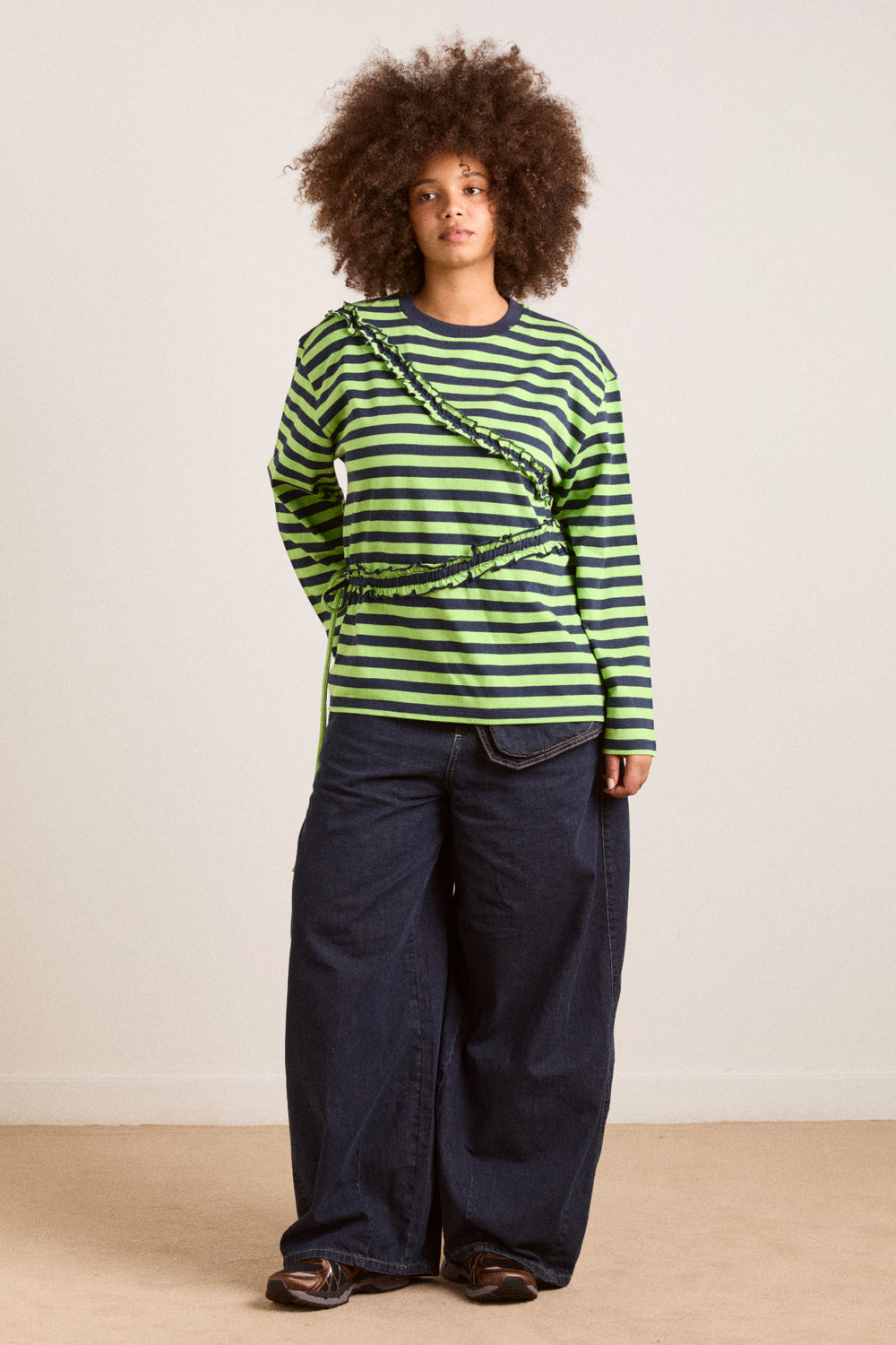 The Prudie Ruffle Long Sleeve Tee brings playful detailing to an easy, oversized silhouette. Designed in a yarn-dyed navy and lime stripe, it features soft self frill accents with adjustable ties to cinch and shape. Finished with a classic crew neck, navy rib trim and signature red DM embroidery at the back neck, it’s a statement tee made for everyday wear.