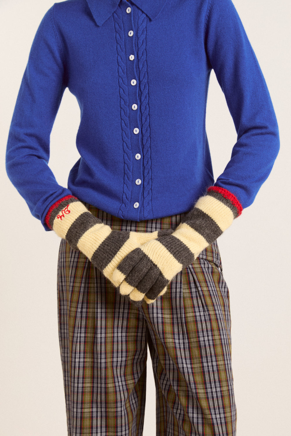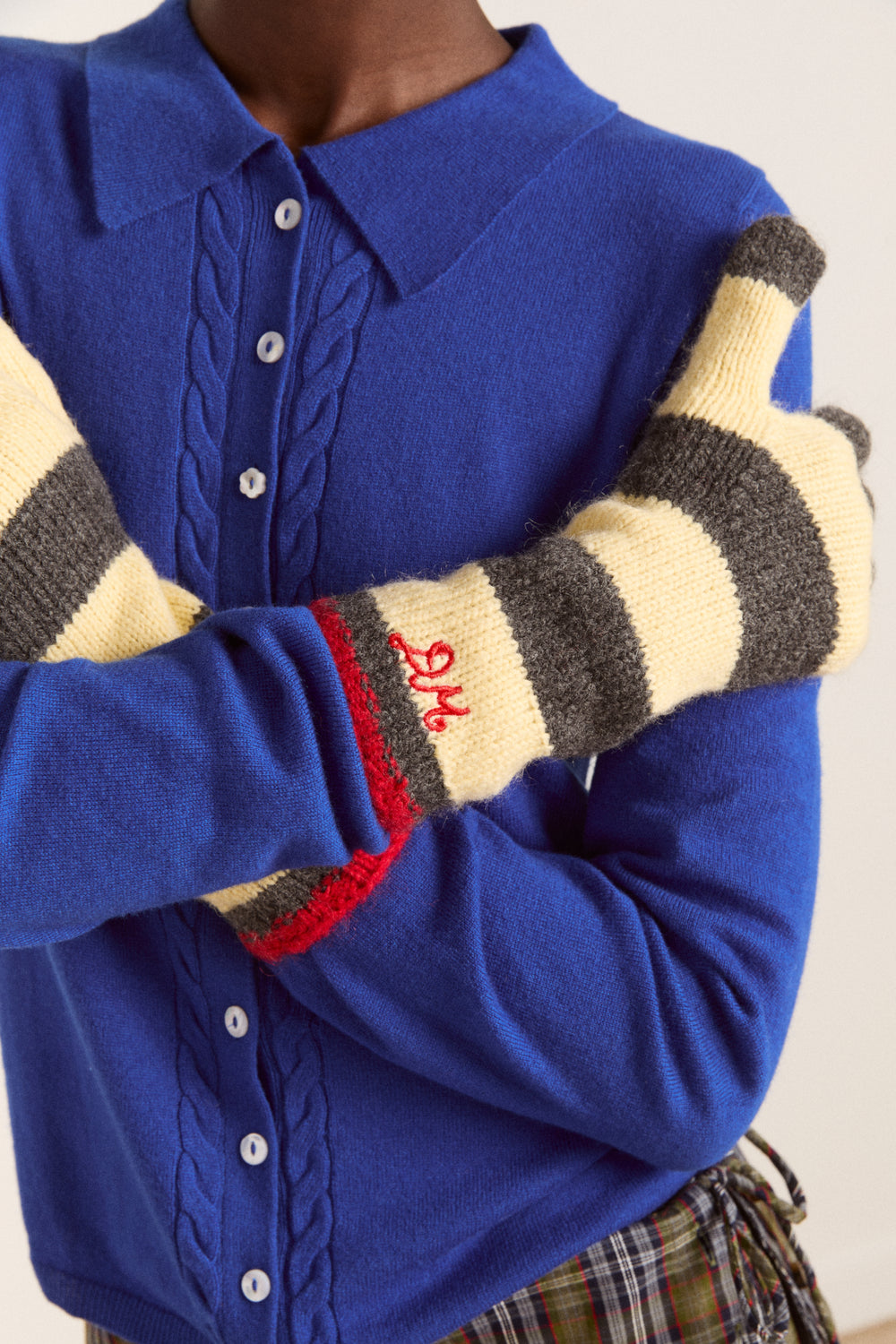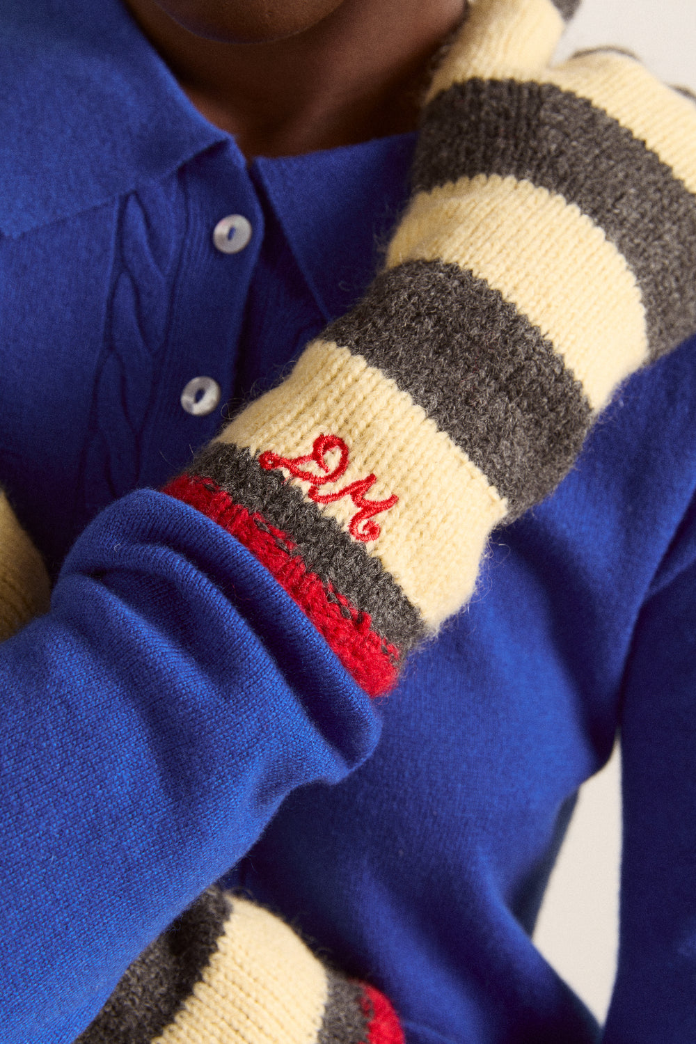 Effortlessly stylish and warm, these longer-length knitted gloves feature a bold stripe design and subtle DM embroidery. Crafted from a soft blend of wool, mohair, recycled nylon, and acrylic for lasting comfort and durability.