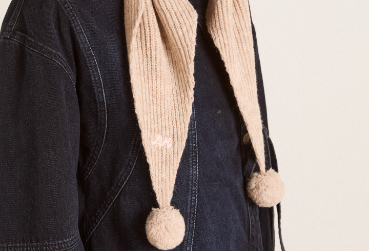 This oatmeal wool knit hood features pom-pom tie ends and can be styled multiple ways; worn as a hood, tied at the front, or wrapped as a scarf. Finished with a contrast pink DM embroidery for a subtle branded detail.