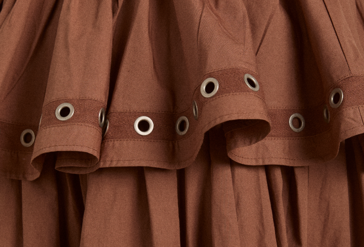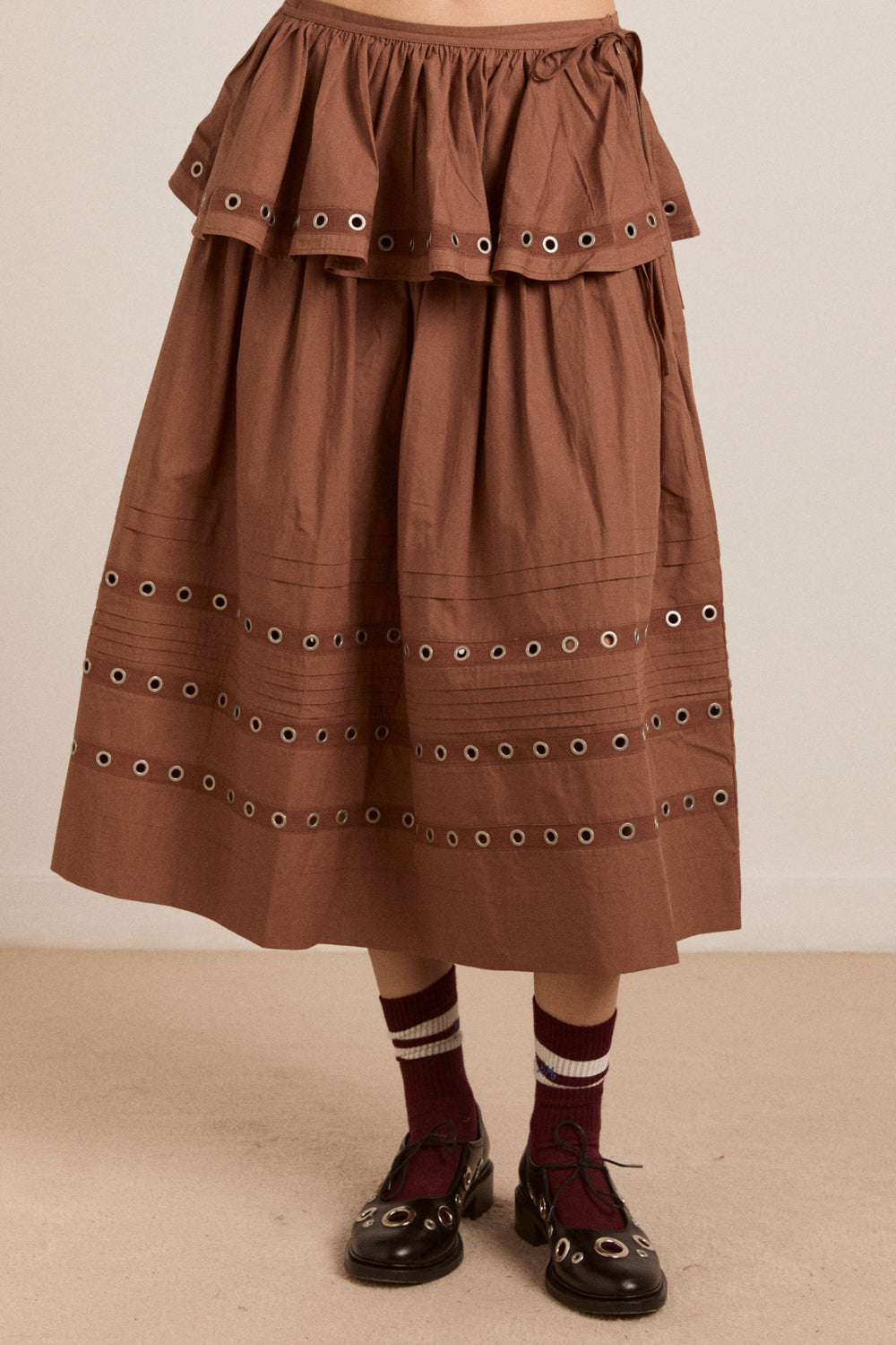 Crafted from 100% organic cotton in a soft tan hue, the Anika Skirt features metal eyelet detailing and a dropped waistband for a modern twist on a classic midi. Finished with a removable ruffle peplum belt and side zip fastening, it’s a versatile piece made to style your way.