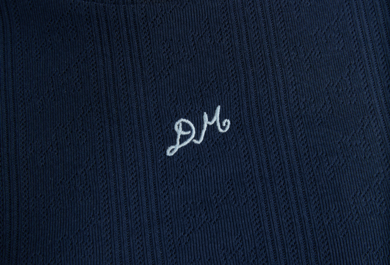 The Aster Pointelle Raglan Baby Tee is made from a sweet pointelle fabric. The signature 'DM' embroidered logo on the front a...