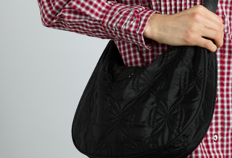Introducing our new crescent bag with bow stitch detailing, realised in a textural quilted fabric.