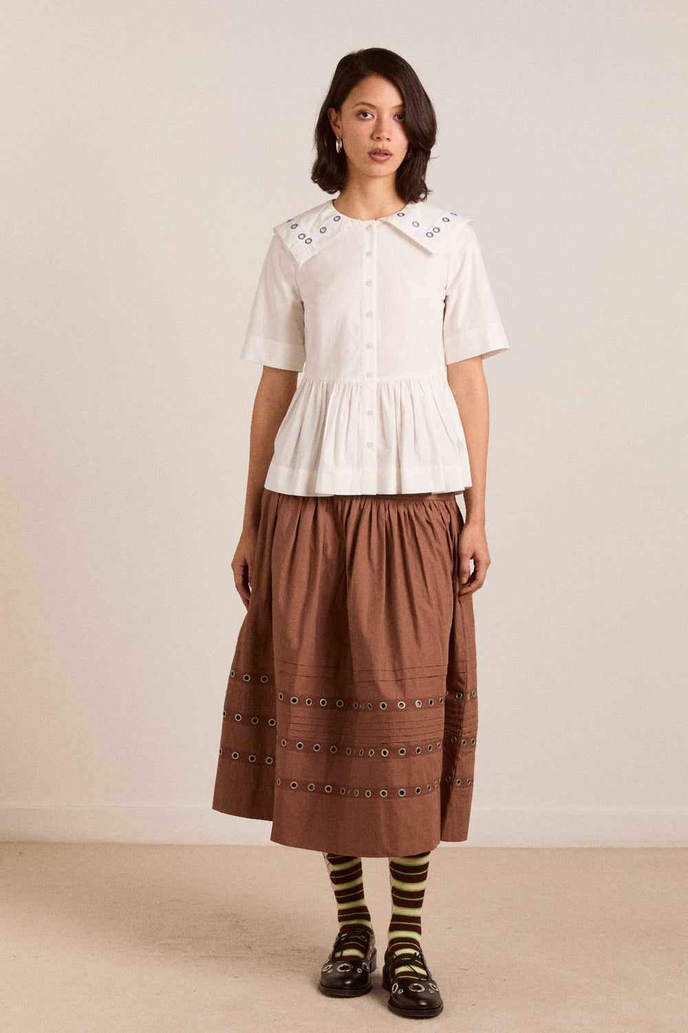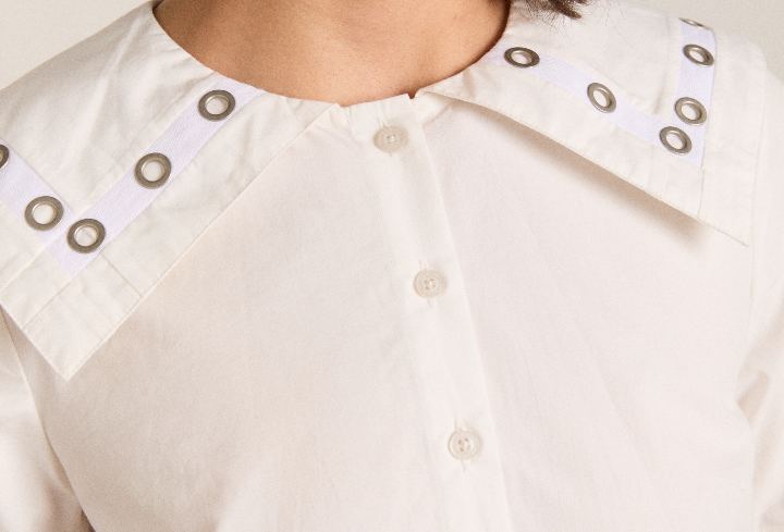 The Cyrus Eyelet Blouse brings a playful yet polished edge to everyday dressing. Crafted from 100% organic cotton, it features metal eyelet details and an oversized collar, creating a standout silhouette that feels both classic and contemporary. Finished with branded buttons, a button-down front, and a soft peplum hem.