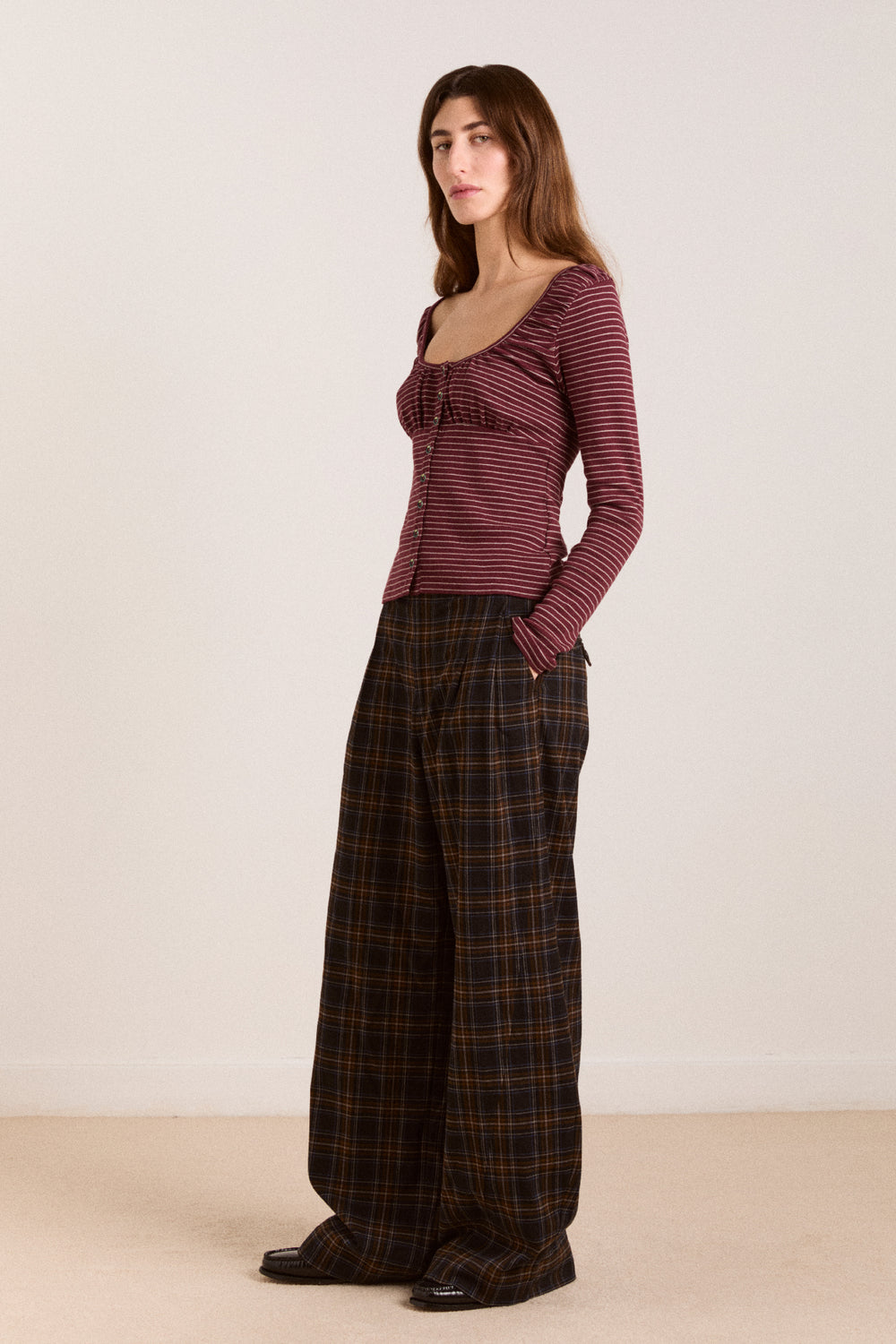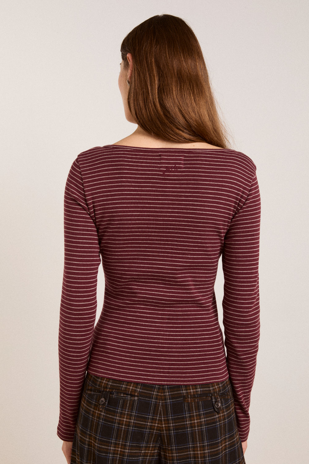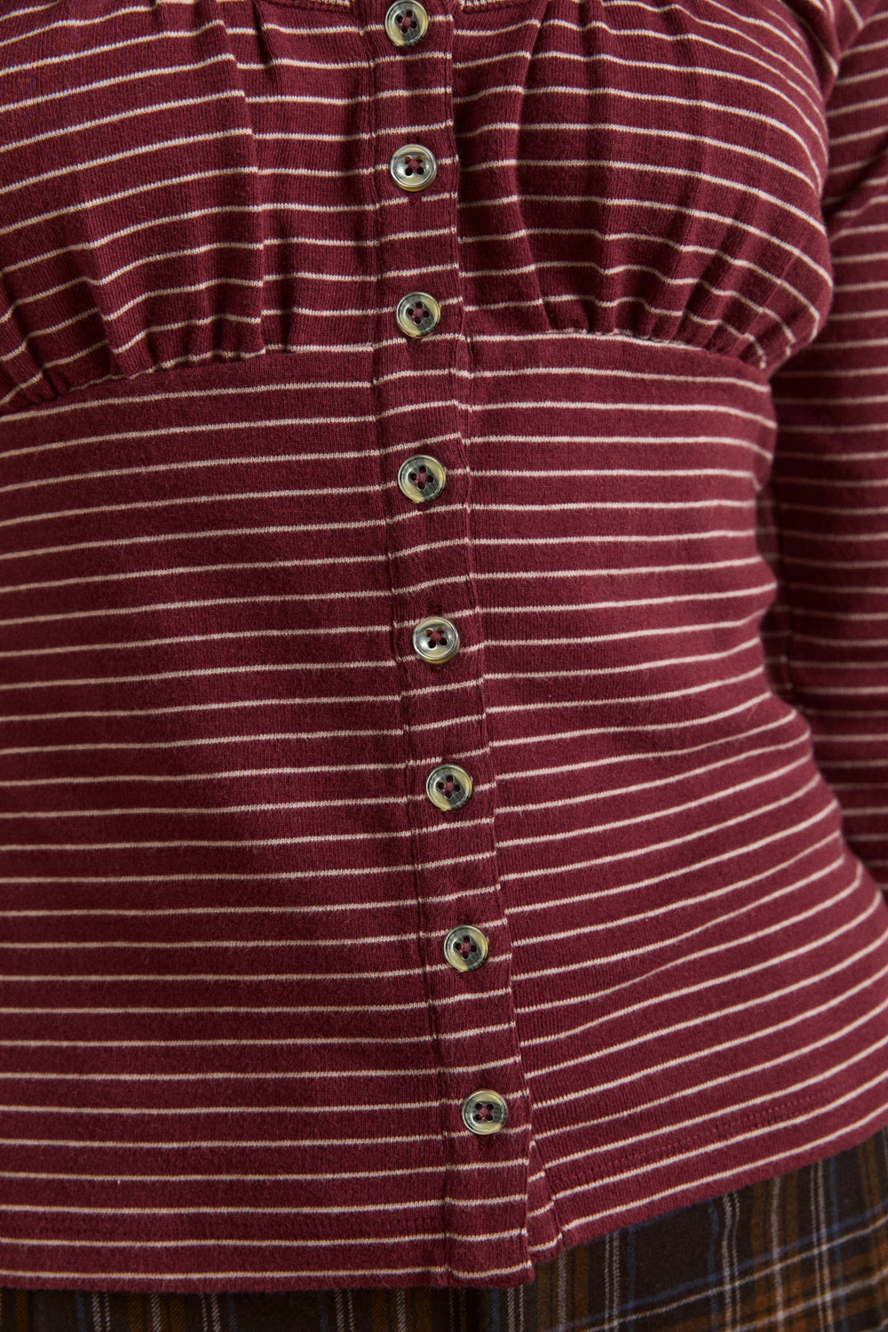 A fresh take on an everyday layer. Made from 100% Organic Cotton, the Darma Cardi features a scoop neck, gathered bust panel, and button-down front in a bold burgundy stripe. Long sleeves and a true-to-size fit make it an easy, effortless staple.