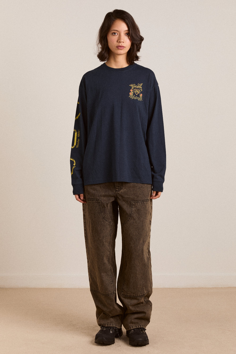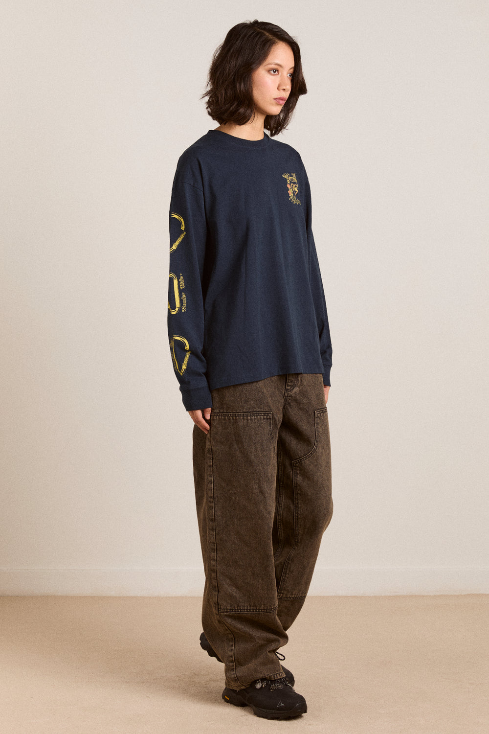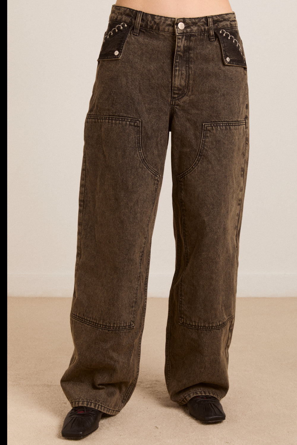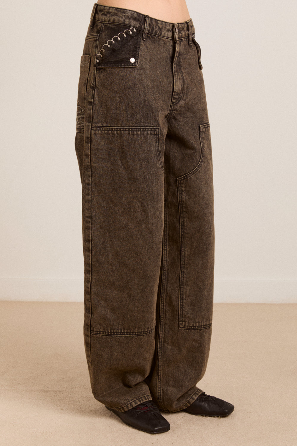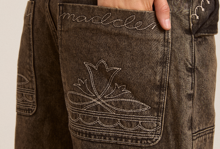 The Dempsie Jean comes in a warm ginger tint wash, crafted from a blend of organic and recycled cotton for a soft yet structured feel. Finished with embroidered pocket details and worker-style knee patches, it brings a playful twist to everyday denim.