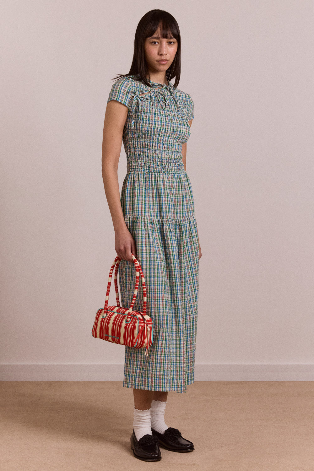 An easy summer silhouette with thoughtful detail. Designed with a flattering smocked bodice and a softly dropped waist skirt, this midi dress is finished with capped sleeves and an asymmetric neck tie for a playful touch.