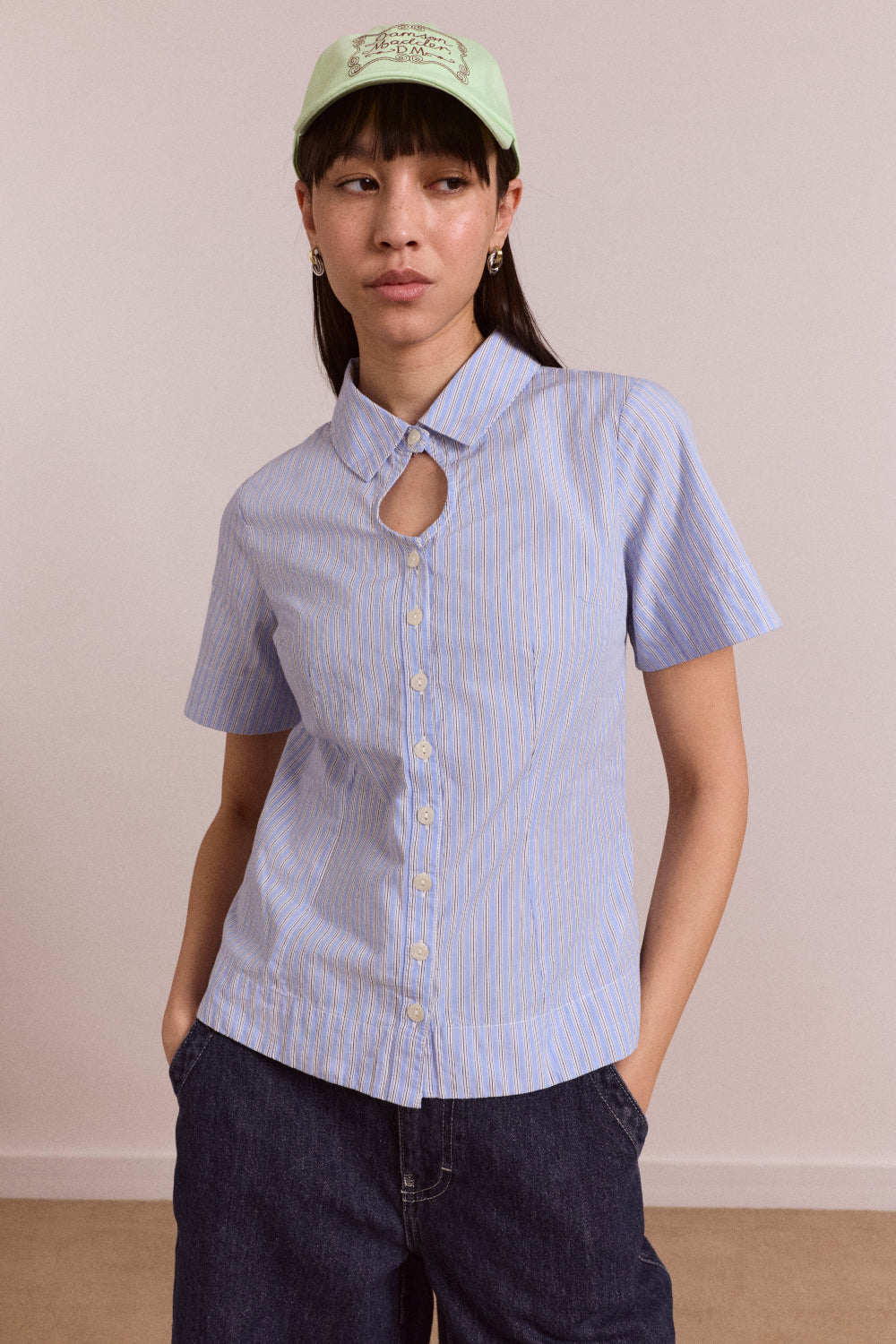 An easy button-down with subtle shaping through the waist for a flattering, relaxed fit. Designed with a delicate keyhole detail and classic stripe, it’s the perfect balance of polished and effortless. Matching skirt available.