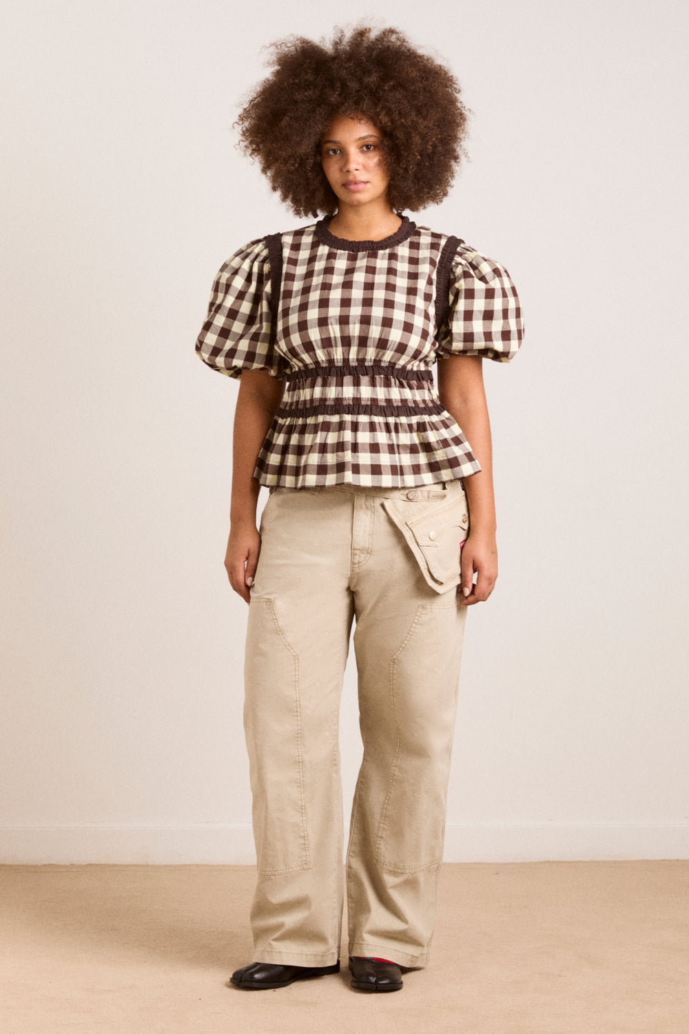 The Everly Ruffle Blouse in Butter Gingham is designed to bring soft structure and playful charm to your wardrobe. Crafted from 100% organic cotton, it features removable puff sleeves secured with discreet button fastenings, giving you styling versatility from day to night. Frill detailing at the neck, arms, and waist adds romantic texture, while a peplum hem creates a flattering, sculpted silhouette.