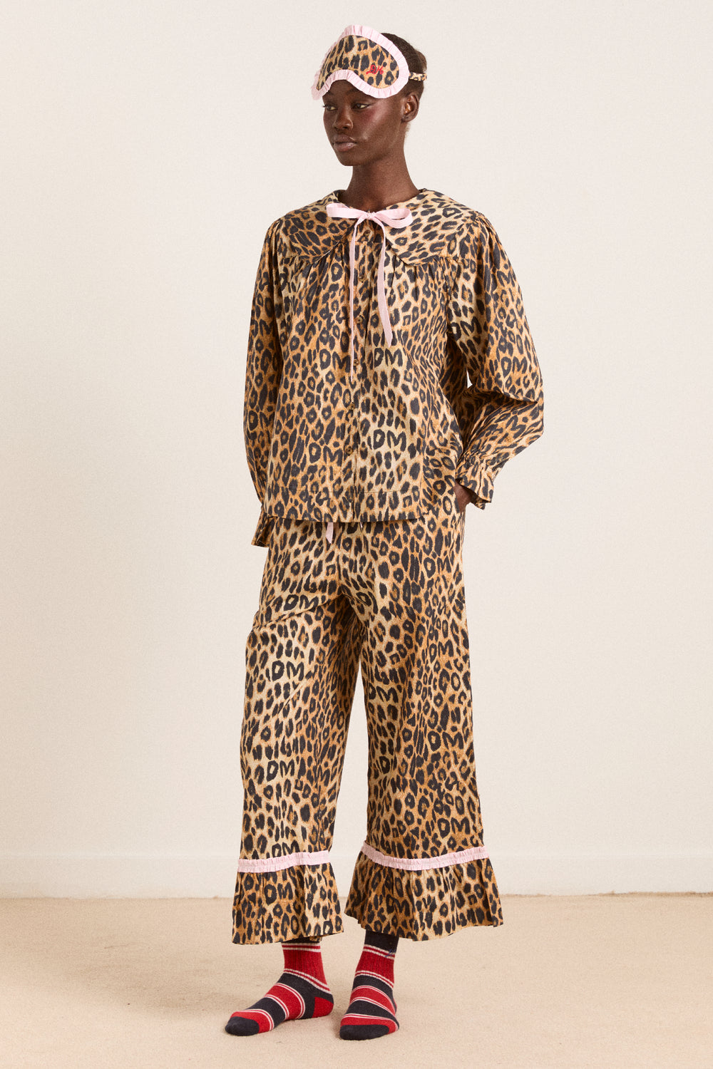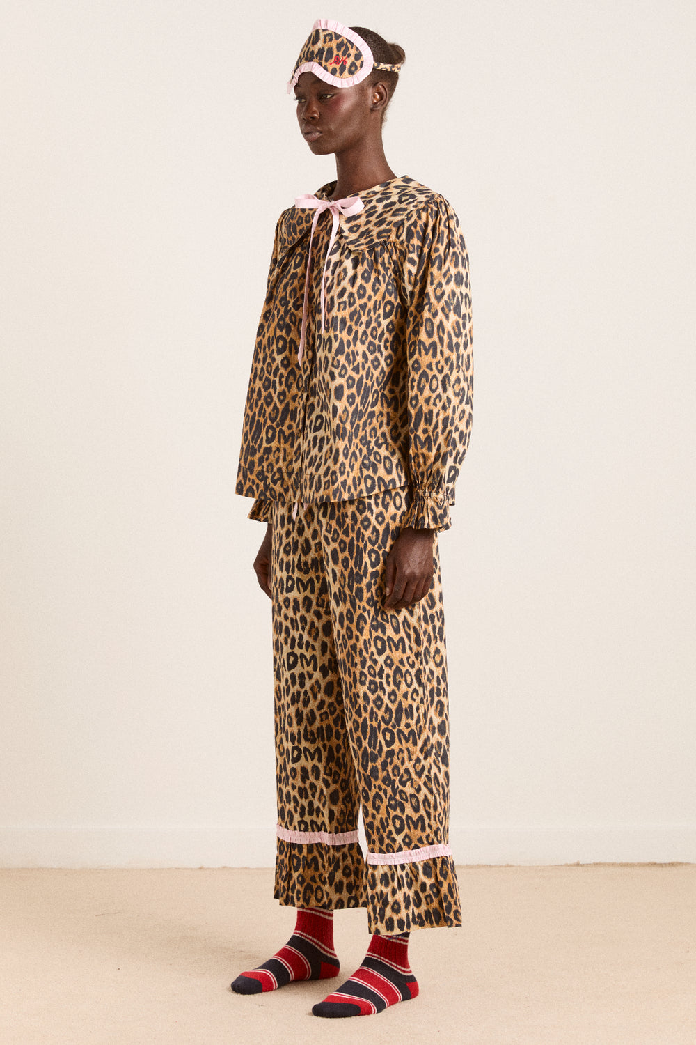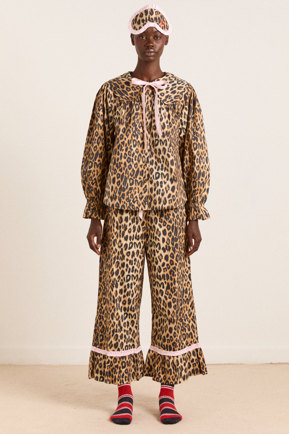 Our iconic Damson Madder leopard print is back in a cosy cotton PJ set, finished with pink contrast frill and bow details. It features a button-up front, oversized collar and comfy cuffed sleeves, designed to keep you looking chic from day to night. Complete with fabric storage bag.