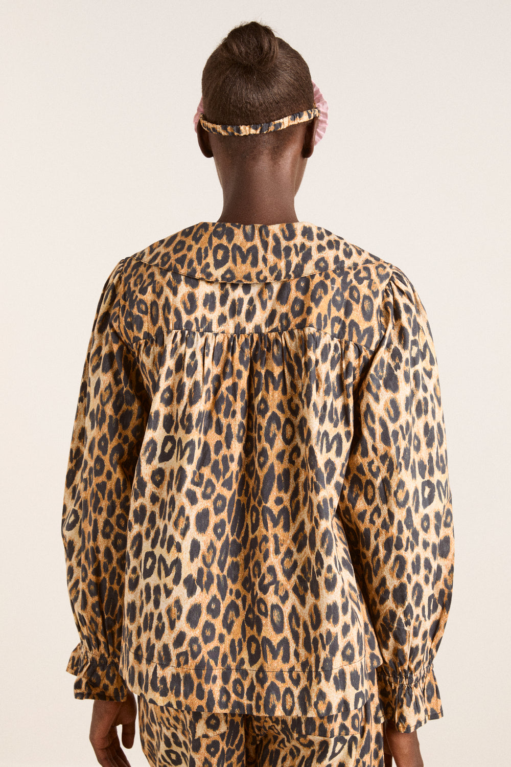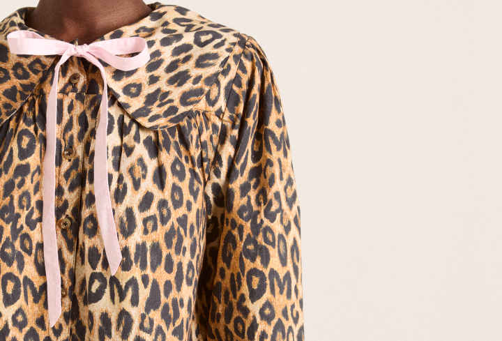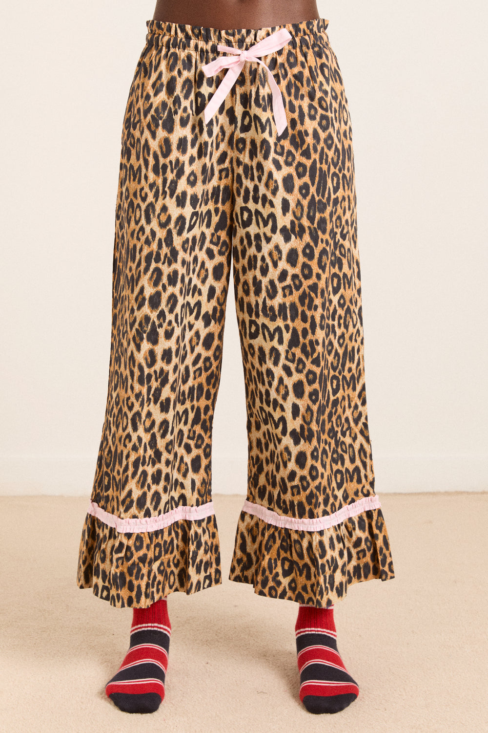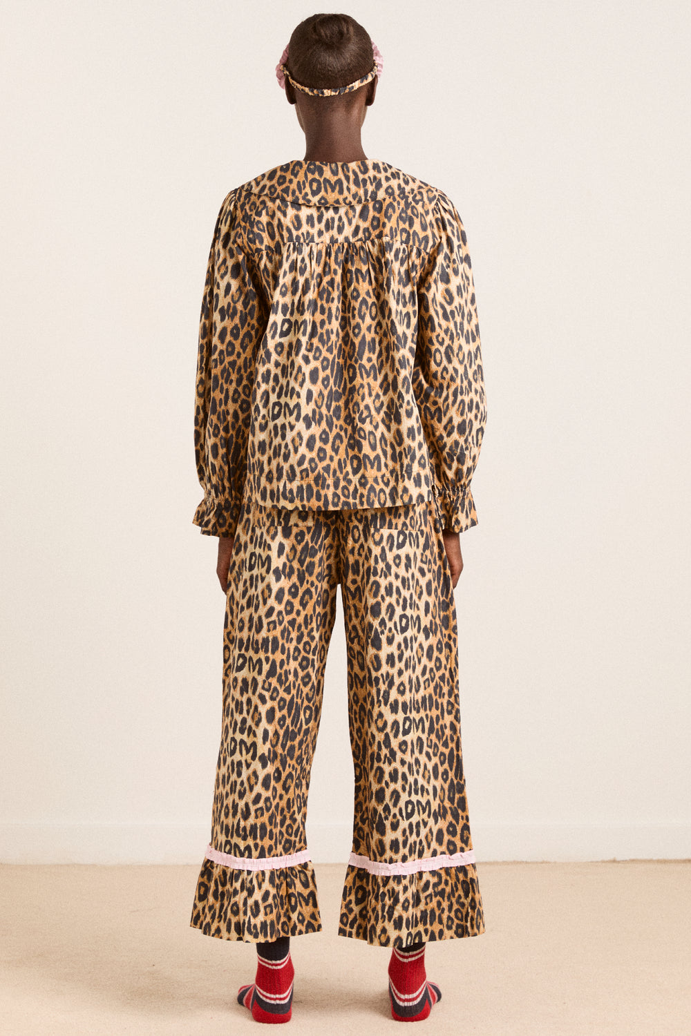 Our iconic Damson Madder leopard print is back in a cosy cotton PJ set, finished with pink contrast frill and bow details. It features a button-up front, oversized collar and comfy cuffed sleeves, designed to keep you looking chic from day to night. Complete with fabric storage bag.