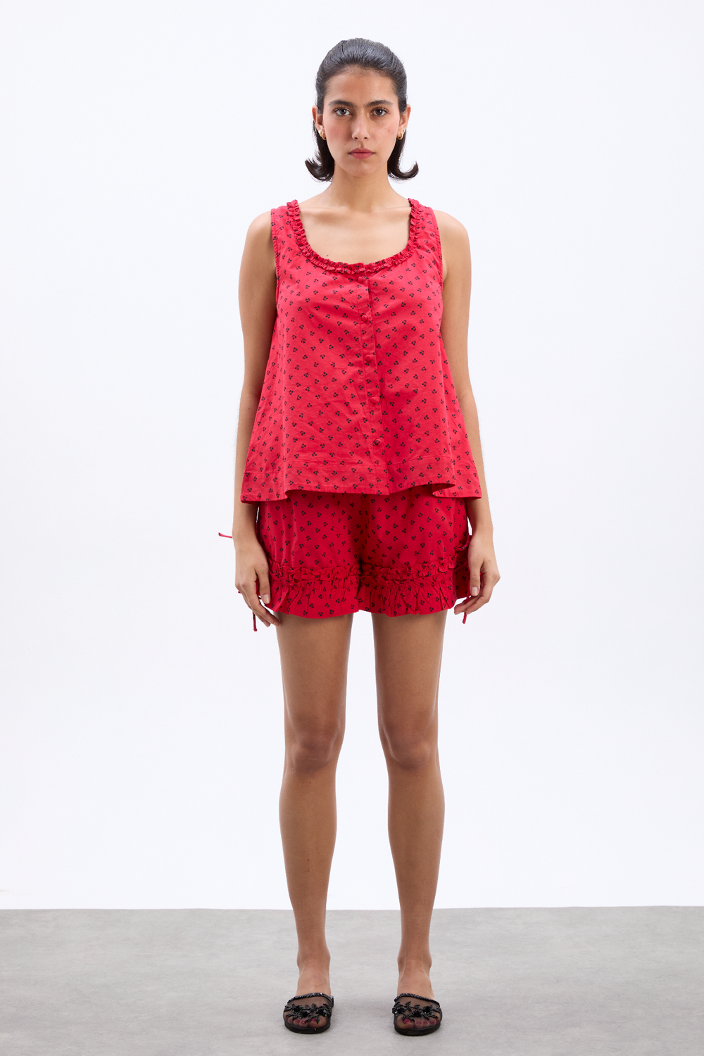A fresh take on our best-selling cherry print, the Mafalda Ruffle Neck Top is designed with a delicate ruffle neckline, button-down front, and sleeveless cut. Crafted from breathable 100% organic cotton, this true-to-size piece pairs perfectly with the matching Mafalda Frilly Tie Boxer.