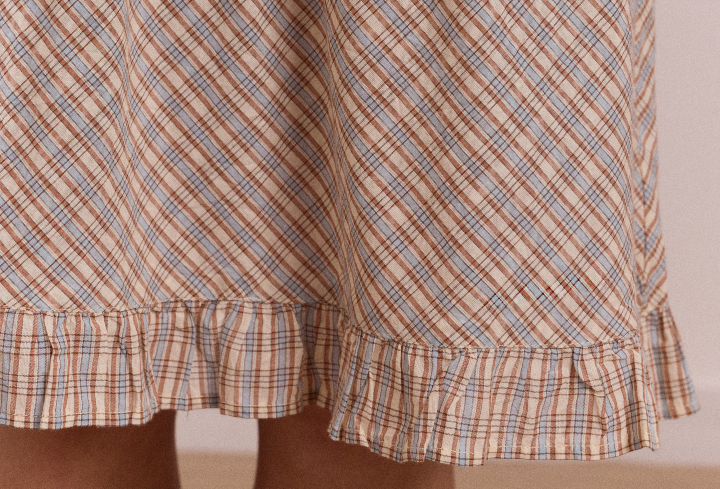 A playful everyday skirt with soft movement. Cut to a knee length with an elasticated waist and functional tie, it features frill detailing at the waist and hem, an asymmetric seam and practical side pockets.