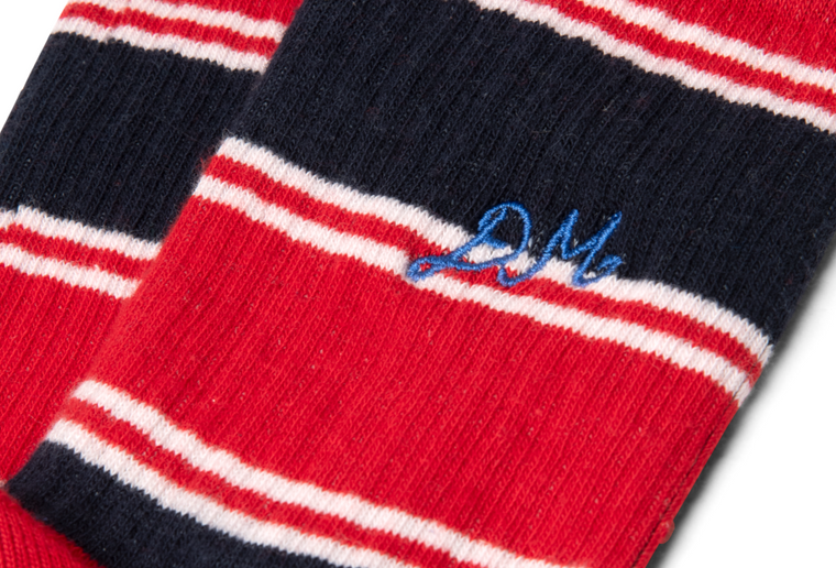 Meet our signature calf length socks in red/navy multi stripe print. Crafted from 75% organic cotton, 23% nylon, and 2% elastane, offering a perfect blend of comfort, durability, and a touch of stretch. The soft, organic cotton ensures a gentle feel against the skin, while the nylon and elastane contribute to enhanced flexibility and shape retention.