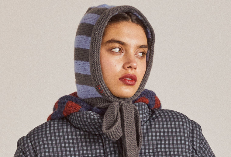 Lean into the season with a knitted Damson Madder bonnet in wintry grey and blue stripes.