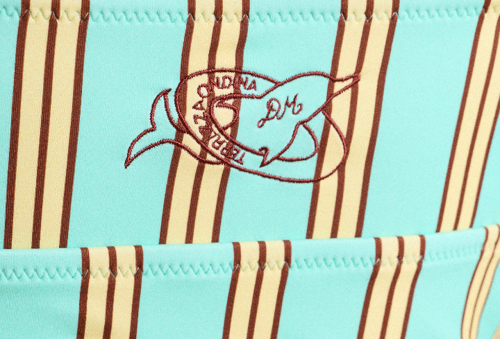 A tankini top with subtle bust seams and an all-over mint stripe print. Features brown picot trim along the neckline and a DM dolphin embroidery at the back, with adjustable straps finished with bead detailing. Pairs perfectly with the coordinating bikini bottoms and boy shorts.