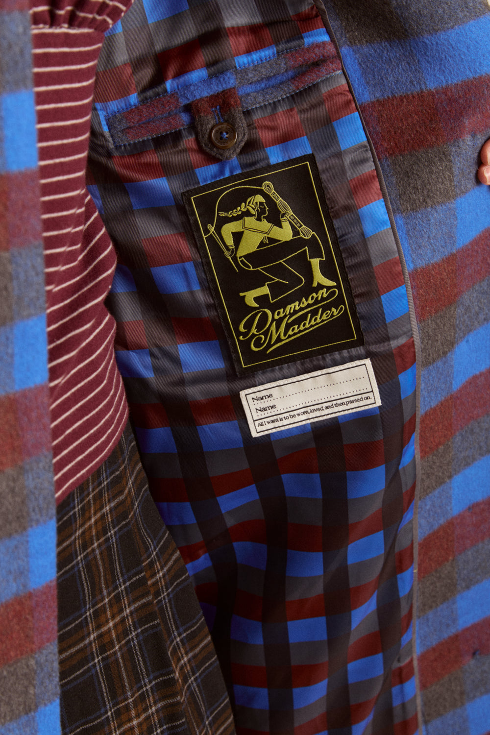 • Heavy wool blend coat with detailed adjustable cuffs, front pockets, adjustable neck button, printed inner lining