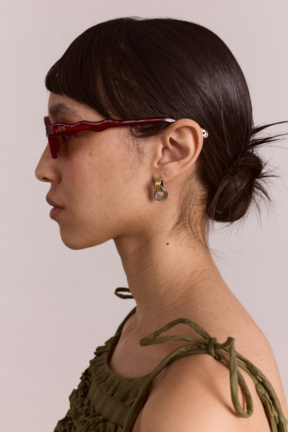 Meet our Slim Oval Sunglasses in our new red colourway, with smoke lenses and a wavy arm with DM branding detailing. Made fro...